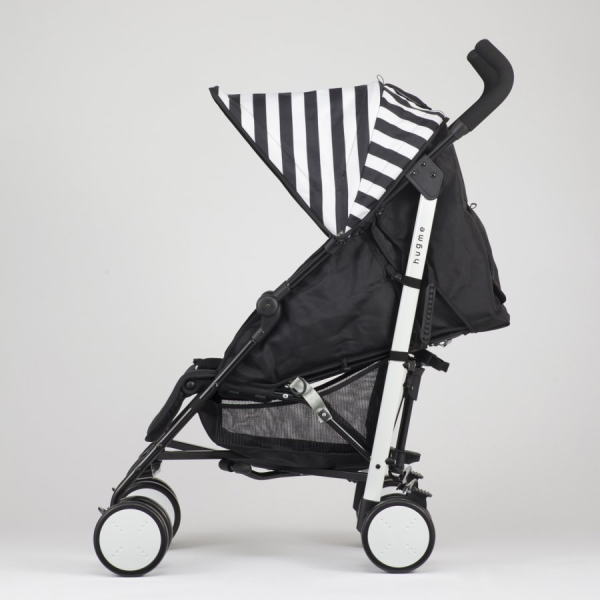 「hugme mini」は、簡単に折りたため、専用スタンドにより自立が可能です。また、タイヤの汚れ移りを防ぐ前輪タイヤカバーも付いています。日除けカバーとレインカバーも標準装備されていて、夏の日差しや雨から赤ちゃんをしっかりと守ってくれます。